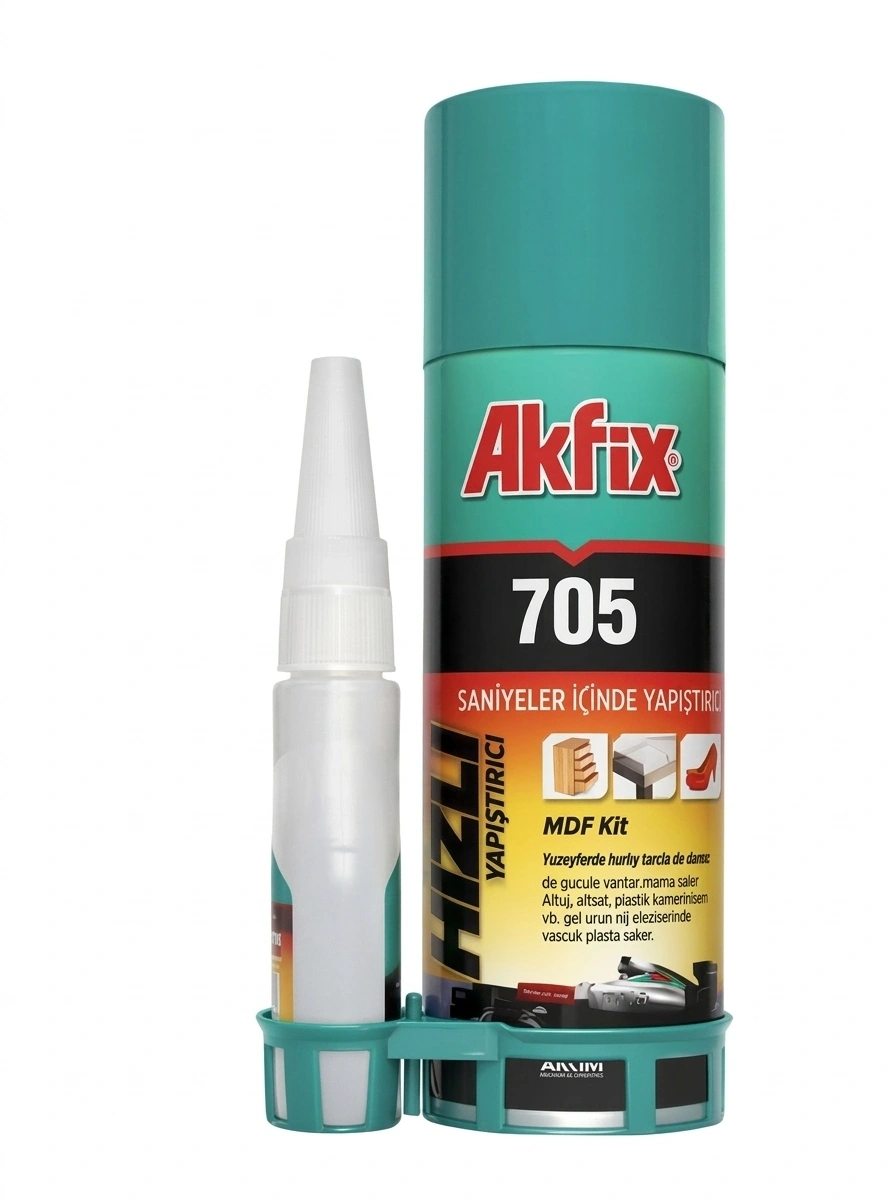 Akfix 705 MDF Kit Hızlı Yapıştırıcı, yüksek viskoziteli siyanoakrilat bazlı yapıştırıcı ve aktivatörden oluşan profesyonel bir yapıştırıcı setidir. İçerisindeki sprey aktivatör ile çok kısa sürede güçlü ve kalıcı bir yapışma sağlar.
