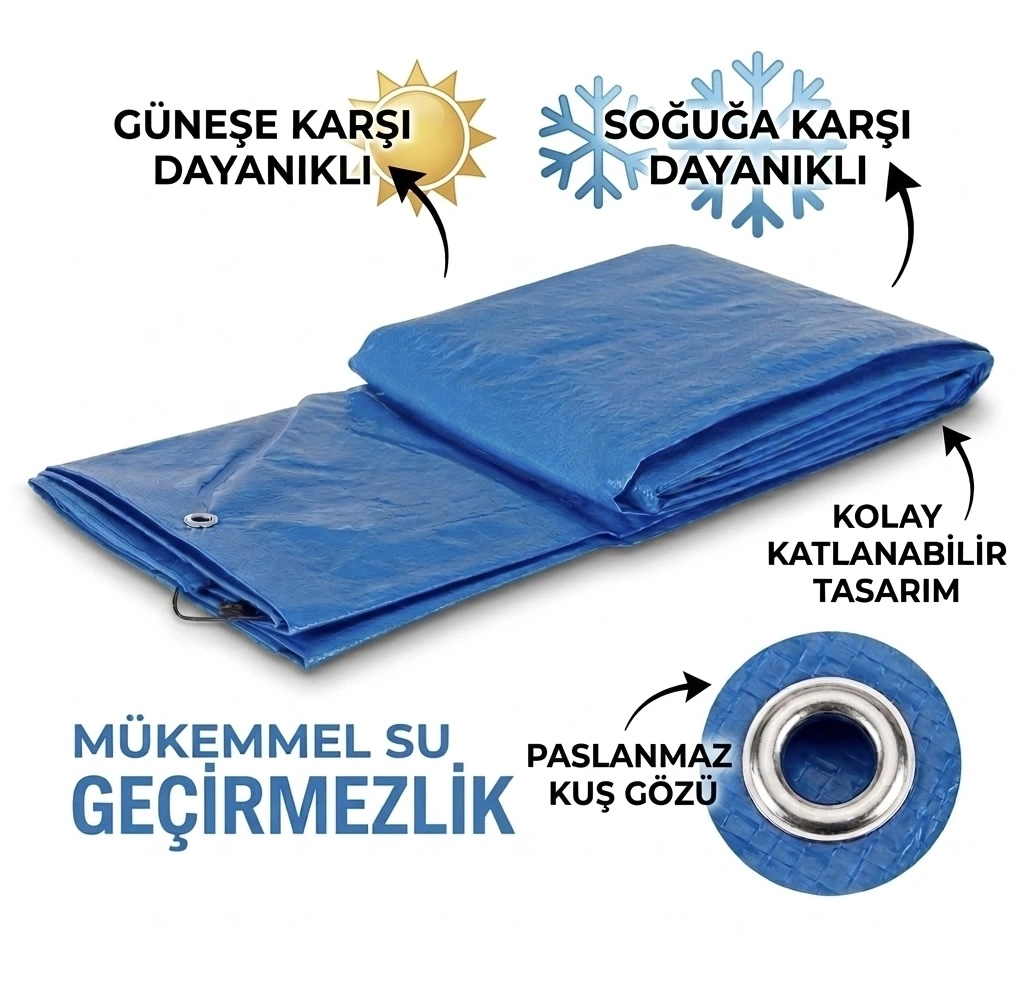 Dayanıklı yapısı ve çok amaçlı kullanım özelliği ile mavi branda, açık ve kapalı alanlarda güvenilir koruma sağlar. Su geçirmez yapısı sayesinde yağmur, kar ve nem gibi dış etkenlere karşı eşyalarınızı korurken, güneşe dayanıklı yapısı ile uzun süreli kullanım imkanı sunar.
